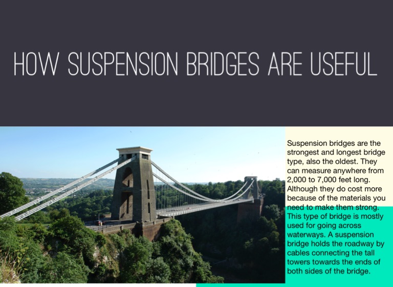Suspension bridges are the strongest and longest bridge type, also the oldest. They can measure anywhere from 2,000 to 7,000 feet long. Although they do cost more because of the materials you need to make them strong. This type of bridge is mostly used for going across waterways. A suspension bridge holds the roadway by cables connecting the tall towers towards the ends of both sides of the bridge.