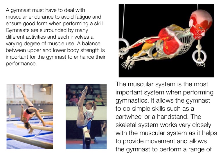 The muscular system is the most important system when performing gymnastics. It allows the gymnast to do simple skills such as a cartwheel or a handstand. The skeletal system works very closely with the muscular system as it helps to provide movement and allows the gymnast to perform a range of skills.