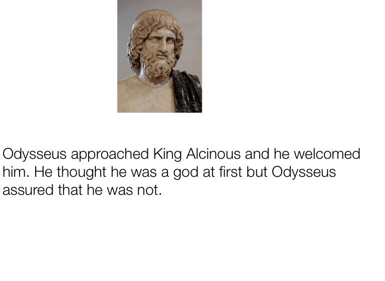 Odysseus approached King Alcinous and he welcomed him. He thought he was a god at first but Odysseus assured that he was not.
