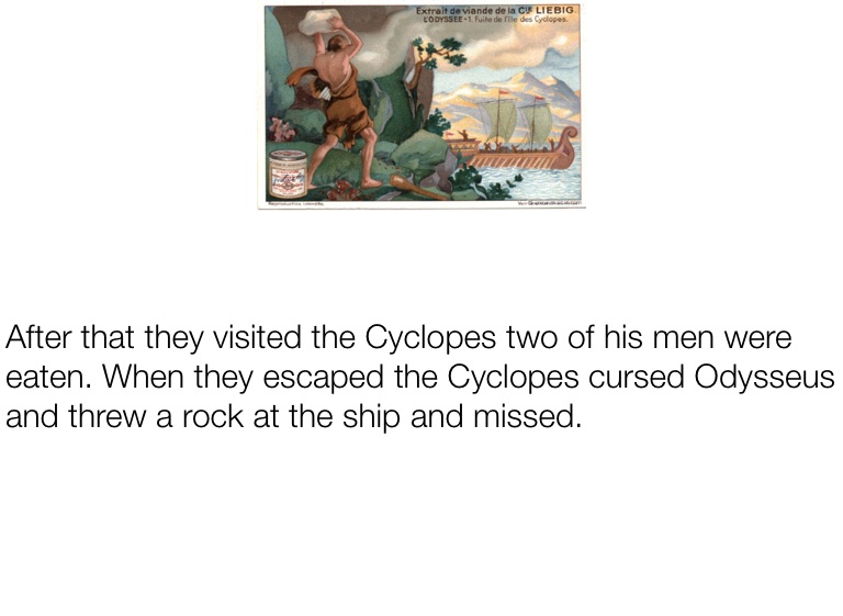 After that they visited the Cyclopes two of his men were eaten. When they escaped the Cyclopes cursed Odysseus and threw a rock at the ship and missed.