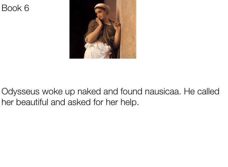 Odysseus woke up naked and found nausicaa. He called her beautiful and asked for her help.