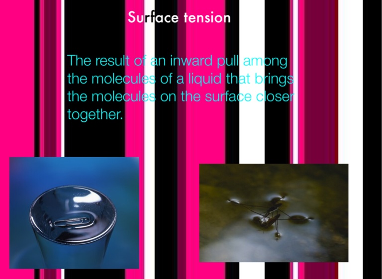 The result of an inward pull among the molecules of a liquid that brings the molecules on the surface closer together.