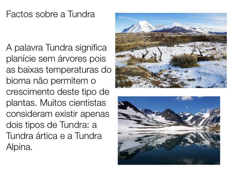 A palavra Tundra significa planície sem árvores pois as baixas temperaturas do bioma não permitem o crescimento deste tipo de plantas. Muitos cientistas consideram existir apenas dois tipos de Tundra: a Tundra ártica e a Tundra Alpina.