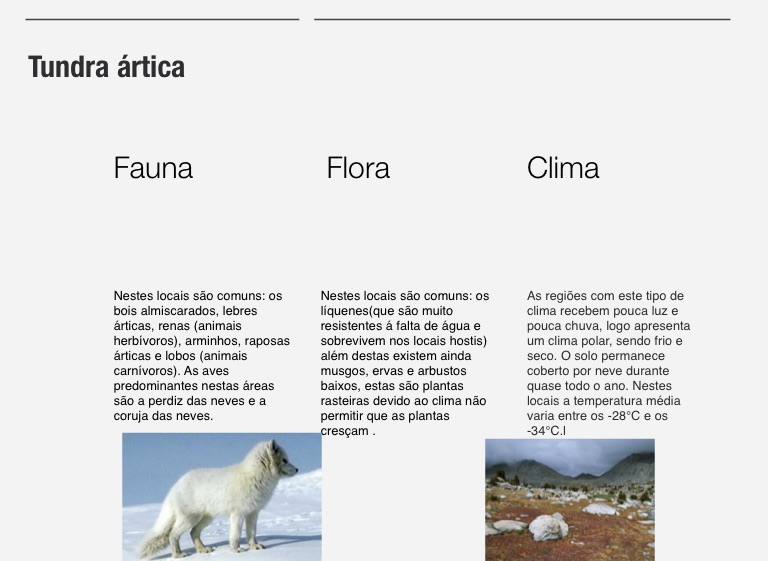 Nestes locais são comuns: os líquenes(que são muito resistentes á falta de água e sobrevivem nos locais hostis) além destas existem ainda musgos, ervas e arbustos baixos, estas são plantas rasteiras devido ao clima não permitir que as plantas cresçam .