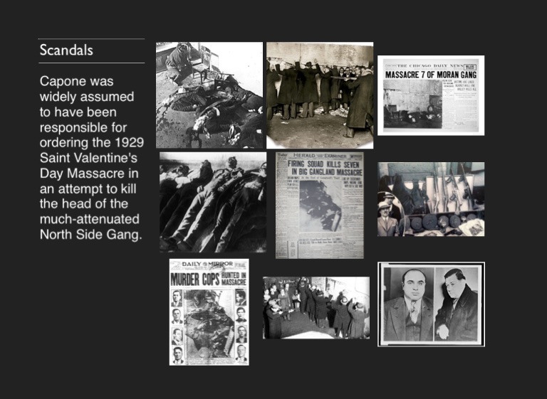 Capone was widely assumed to have been responsible for ordering the 1929 Saint Valentine's Day Massacre in an attempt to kill the head of the much-attenuated North Side Gang.