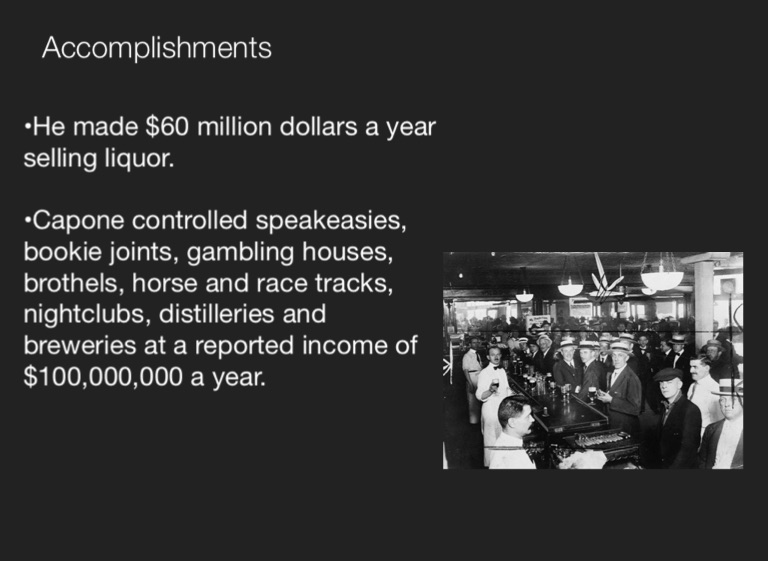 •Capone controlled speakeasies, bookie joints, gambling houses, brothels, horse and race tracks, nightclubs, distilleries and breweries at a reported income of $100,000,000 a year.