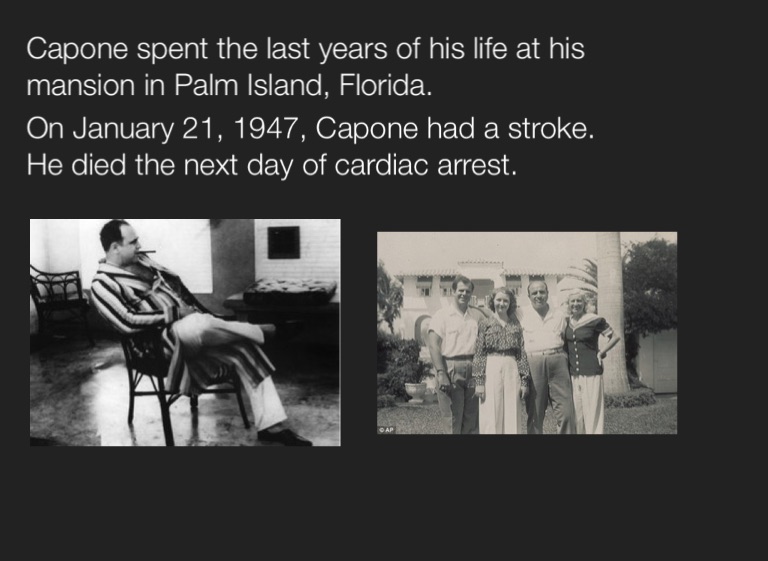 Capone spent the last years of his life at his mansion in Palm Island, Florida.