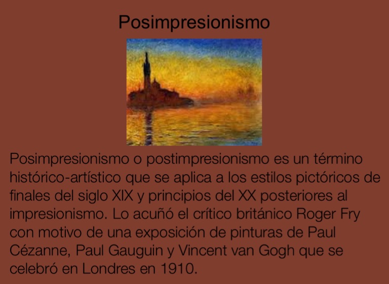 Posimpresionismo o postimpresionismo es un término histórico-artístico que se aplica a los estilos pictóricos de finales del siglo XIX y principios del XX posteriores al impresionismo. Lo acuñó el crítico británico Roger Fry con motivo de una exposición de pinturas de Paul Cézanne, Paul Gauguin y Vincent van Gogh que se celebró en Londres en 1910.
