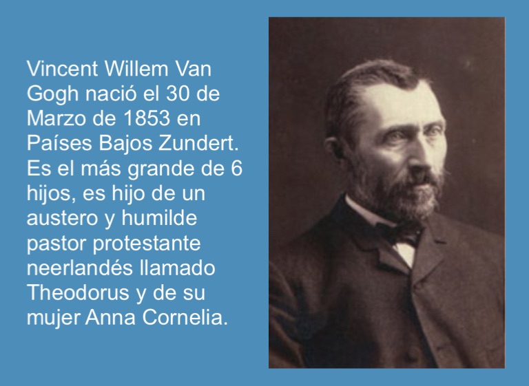 Vincent Willem Van Gogh nació el 30 de Marzo de 1853 en Países Bajos Zundert. Es el más grande de 6 hijos, es hijo de un austero y humilde pastor protestante neerlandés llamado Theodorus y de su mujer Anna Cornelia.