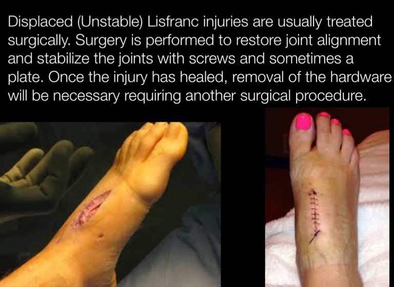 Displaced (Unstable) Lisfranc injuries are usually treated surgically. Surgery is performed to restore joint alignment and stabilize the joints with screws and sometimes a plate. Once the injury has healed, removal of the hardware will be necessary requiring another surgical procedure.