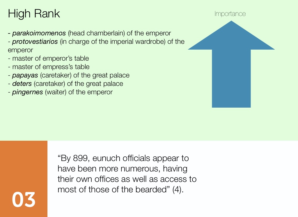“By 899, eunuch officials appear to have been more numerous, having their own offices as well as access to most of those of the bearded” (4).