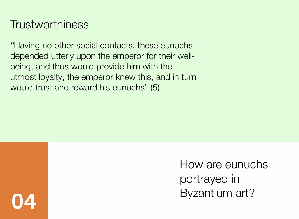 “Having no other social contacts, these eunuchs depended utterly upon the emperor for their well-being, and thus would provide him with the utmost loyalty; the emperor knew this, and in turn would trust and reward his eunuchs” (5)