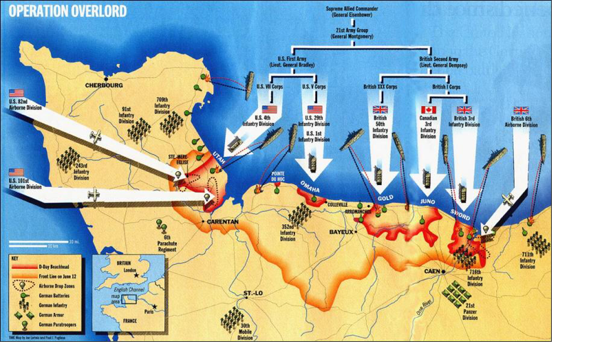 This map shows all of the beaches and bases during operation "Overlord." As seen on the map the US attack the majority of the west, while Britain and Canada fight in the east.