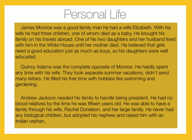 Quincy Adams was the complete opposite of Monroe. He hardly spent any time with his wife. They took separate summer vacations, didn't send many letters. He filled his free time with hobbies like swimming and gardening.