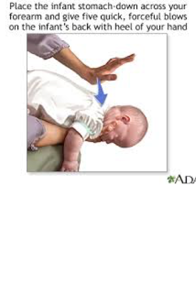 -Deliver up to five back blows, forcefully, between the infant's shoulder blades using the heel of your hand.