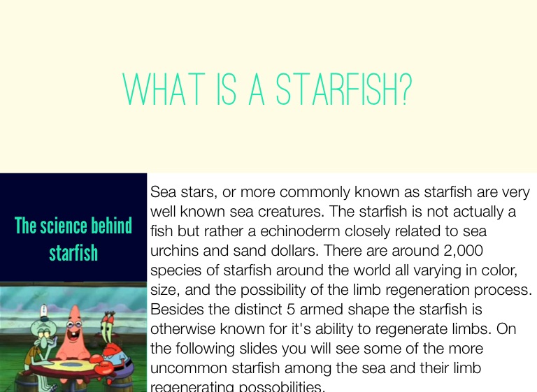 Sea stars, or more commonly known as starfish are very well known sea creatures. The starfish is not actually a fish but rather a echinoderm closely related to sea urchins and sand dollars. There are around 2,000 species of starfish around the world all varying in color, size, and the possibility of the limb regeneration process. Besides the distinct 5 armed shape the starfish is otherwise known for it's ability to regenerate limbs. On the following slides you will see some of the more uncommon starfish among the sea and their limb regenerating possobilities.