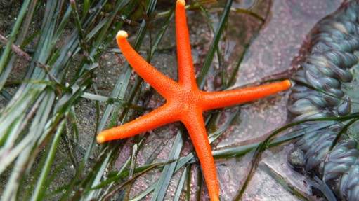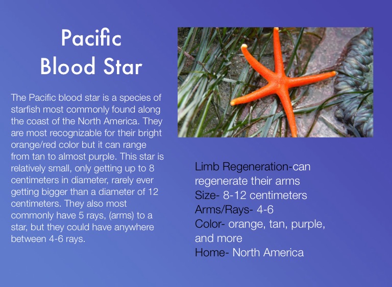 The Pacific blood star is a species of starfish most commonly found along the coast of the North America. They are most recognizable for their bright orange/red color but it can range from tan to almost purple. This star is relatively small, only getting up to 8 centimeters in diameter, rarely ever getting bigger than a diameter of 12 centimeters. They also most commonly have 5 rays, (arms) to a star, but they could have anywhere between 4-6 rays.