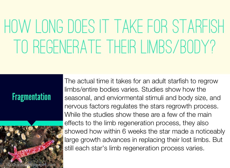The actual time it takes for an adult starfish to regrow limbs/entire bodies varies. Studies show how the seasonal, and enviormental stimuli and body size, and nervous factors regulates the stars regrowth process. While the studies show these are a few of the main effects to the limb regeneration process, they also showed how within 6 weeks the star made a noticeably large growth advances in replacing their lost limbs. But still each star's limb regeneration process varies.