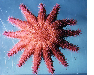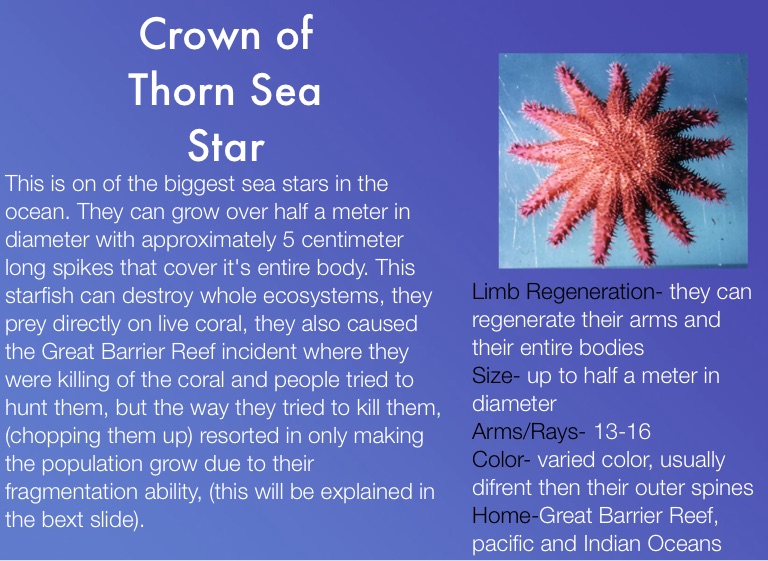 This is on of the biggest sea stars in the ocean. They can grow over half a meter in diameter with approximately 5 centimeter long spikes that cover it's entire body. This starfish can destroy whole ecosystems, they prey directly on live coral, they also caused the Great Barrier Reef incident where they were killing of the coral and people tried to hunt them, but the way they tried to kill them, (chopping them up) resorted in only making the population grow due to their fragmentation ability, (this will be explained in the bext slide).