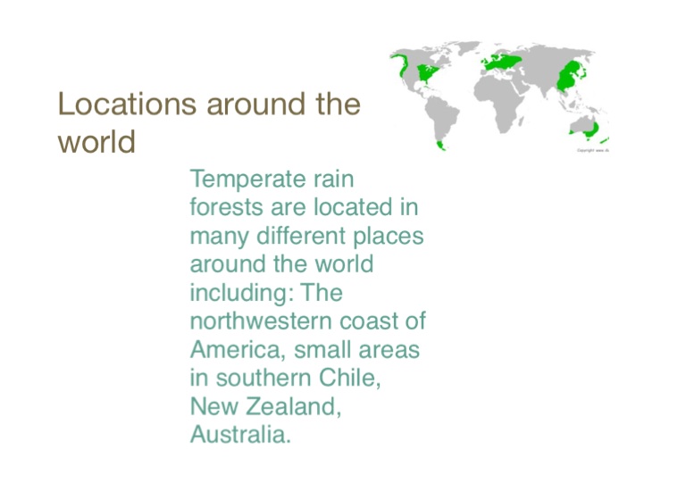 Temperate rain forests are located in many different places around the world including: The northwestern coast of America, small areas in southern Chile, New Zealand, Australia.