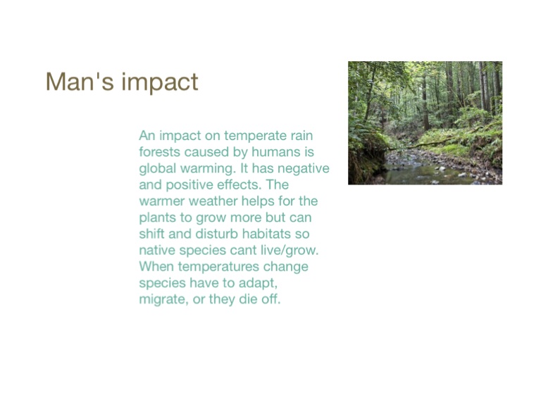 An impact on temperate rain forests caused by humans is global warming. It has negative and positive effects. The warmer weather helps for the plants to grow more but can shift and disturb habitats so native species cant live/grow. When temperatures change species have to adapt, migrate, or they die off.