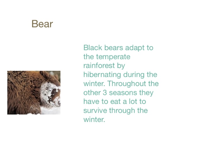 Black bears adapt to the temperate rainforest by hibernating during the winter. Throughout the other 3 seasons they have to eat a lot to survive through the winter.