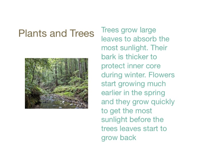 Trees grow large leaves to absorb the most sunlight. Their bark is thicker to protect inner core during winter. Flowers start growing much earlier in the spring and they grow quickly to get the most sunlight before the trees leaves start to grow back