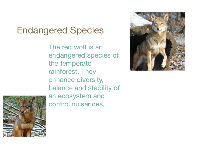 The red wolf is an endangered species of the temperate rainforest. They enhance diversity, balance and stability of an ecosystem and control nuisances.