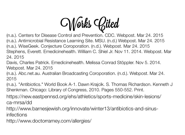 (n.a.). "Antibiotics." World Book A-1. Dawn Krajcik. S. Thomas Richardson. Kenneth J Shenkman. Chicago: Library of Congress, 2010. Pages 550-552. Print.