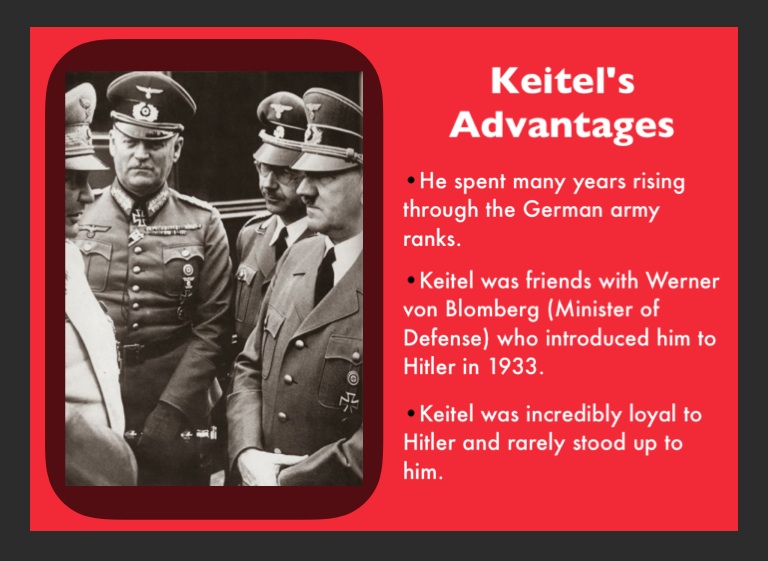 •Keitel was friends with Werner von Blomberg (Minister of Defense) who introduced him to Hitler in 1933.