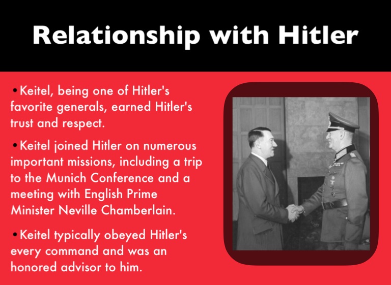•Keitel, being one of Hitler's favorite generals, earned Hitler's trust and respect.