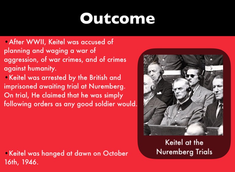 •Keitel was arrested by the British and imprisoned awaiting trial at Nuremberg. On trial, He claimed that he was simply following orders as any good soldier would.