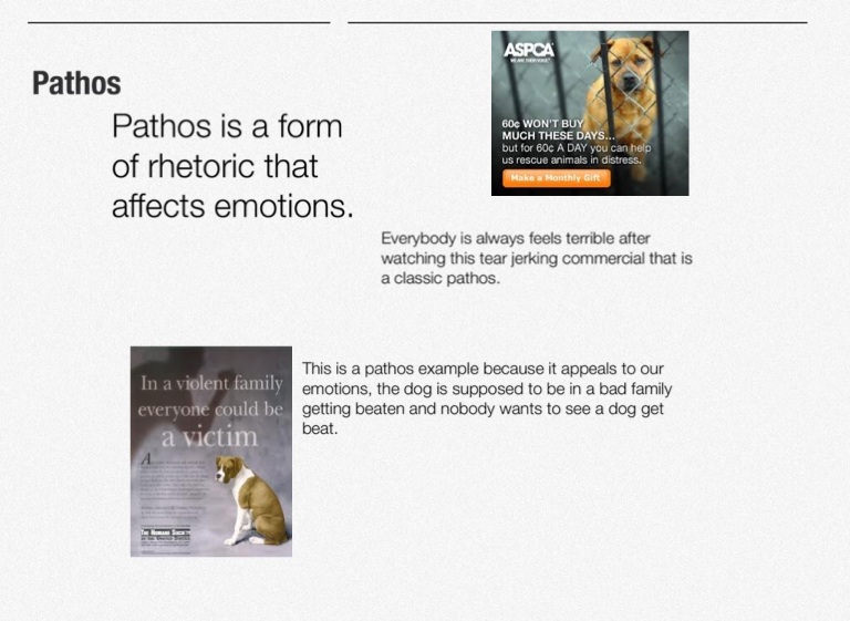 This is a pathos example because it appeals to our emotions, the dog is supposed to be in a bad family getting beaten and nobody wants to see a dog get beat.