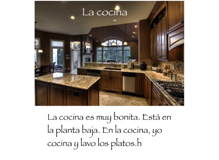 La cocina es muy bonita. Está en la planta baja. En la cocina, yo cocina y lavo los platos.h