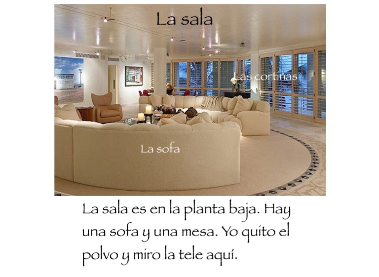La sala es en la planta baja. Hay una sofa y una mesa. Yo quito el polvo y miro la tele aquí.