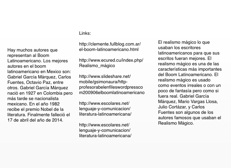 El realismo mágico lo que usaban los escritores latinoamericanos para que sus escritos fueran mejores. El realismo mágico es una de las características más importantes del Boom Latinoamericano. El realismo mágico es usado como eventos irreales o con un poco de fantasía pero como si fuera real. Gabriel García Márquez, Mario Vargas Llosa, Julio Cortázar, y Carlos Fuentes son algunos de los autores famosos que usaban el Realismo Mágico.