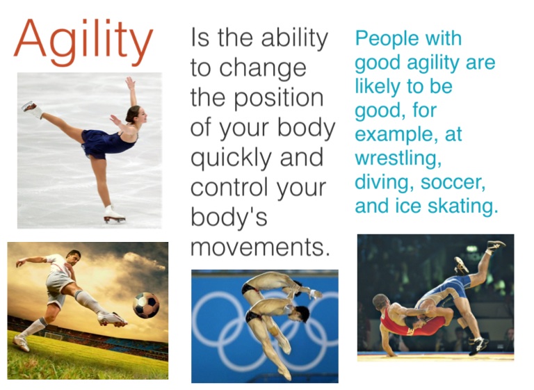 People with good agility are likely to be good, for example, at wrestling, diving, soccer, and ice skating.