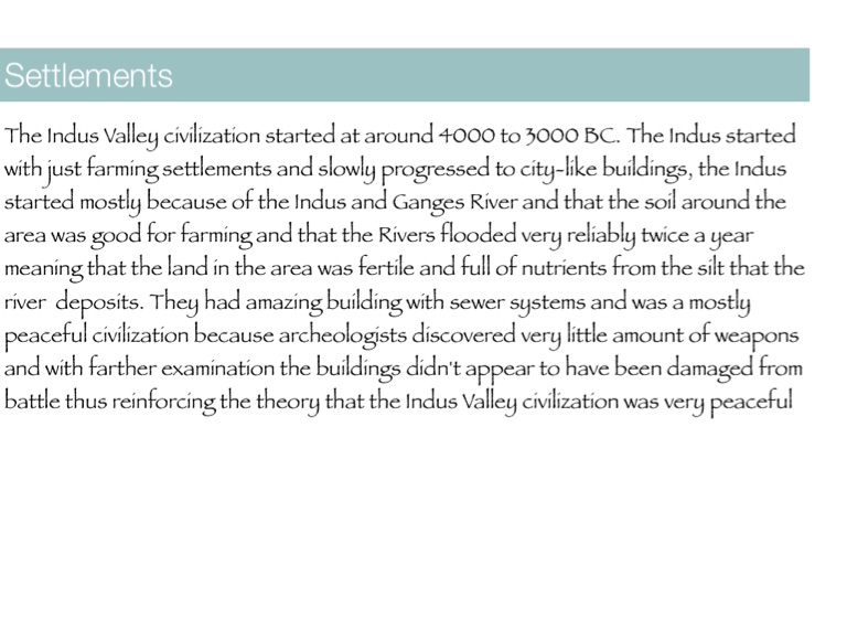 The Indus Valley civilization started at around 4000 to 3000 BC. The Indus started with just farming settlements and slowly progressed to city-like buildings, the Indus started mostly because of the Indus and Ganges River and that the soil around the area was good for farming and that the Rivers flooded very reliably twice a year meaning that the land in the area was fertile and full of nutrients from the silt that the river deposits. They had amazing building with sewer systems and was a mostly peaceful civilization because archeologists discovered very little amount of weapons and with farther examination the buildings didn't appear to have been damaged from battle thus reinforcing the theory that the Indus Valley civilization was very peaceful