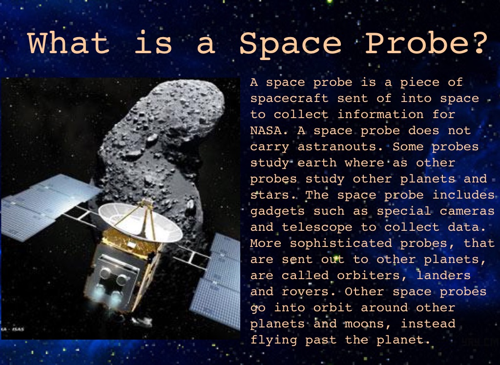 A space probe is a piece of spacecraft sent of into space to collect information for NASA. A space probe does not carry astranouts. Some probes study earth where as other probes study other planets and stars. The space probe includes gadgets such as special cameras and telescope to collect data. More sophisticated probes, that are sent out to other planets, are called orbiters, landers and rovers. Other space probes go into orbit around other planets and moons, instead flying past the planet.