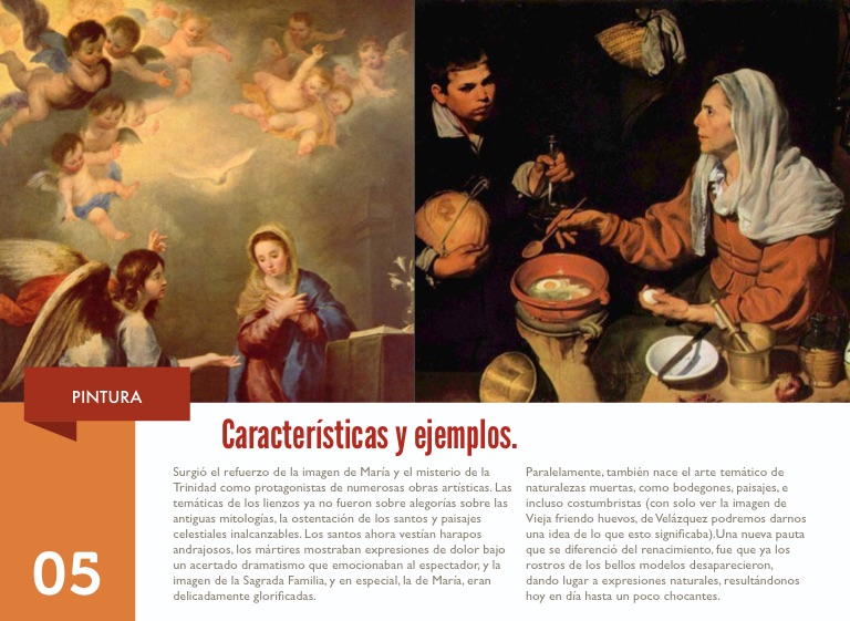 Surgió el refuerzo de la imagen de María y el misterio de la Trinidad como protagonistas de numerosas obras artísticas. Las temáticas de los lienzos ya no fueron sobre alegorías sobre las antiguas mitologías, la ostentación de los santos y paisajes celestiales inalcanzables. Los santos ahora vestían harapos andrajosos, los mártires mostraban expresiones de dolor bajo un acertado dramatismo que emocionaban al espectador, y la imagen de la Sagrada Familia, y en especial, la de María, eran delicadamente glorificadas.