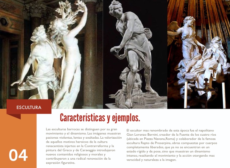 Las esculturas barrocas se distinguen por su gran movimiento y el dinamismo. Las imágenes muestran pasiones violentas, lentas y exaltadas. La valorización de aquellos motivos heroicos de la cultura renacentista injertos en la Contrarreforma y la pintura del Greco y de Caravaggio introdujeron nuevos contenidos religiosos y morales y contribuyeron a una radical renovación de la expresión figurativa.