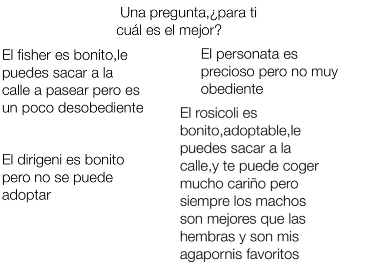 El rosicoli es bonito,adoptable,le puedes sacar a la calle,y te puede coger mucho cariño pero siempre los machos son mejores que las hembras y son mis agapornis favoritos