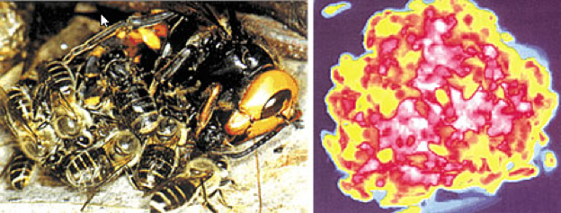 Honey bees seem small and defenseless, right? Western honey bees really only have their stingers to protect themselves and their hives, but Japanese honey bees are much more fierce and have a very special way to protect themselves from invading hornets. Japanese honey bees will surround the hornet and vibrate quickly, building heat from their bodies, and slowly cooking the hornet until it dies!