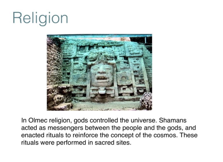In Olmec religion, gods controlled the universe. Shamans acted as messengers between the people and the gods, and enacted rituals to reinforce the concept of the cosmos. These rituals were performed in sacred sites.