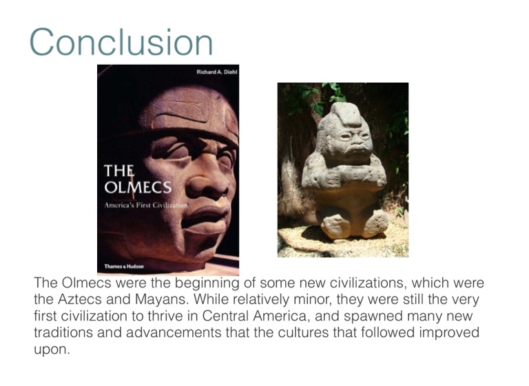 The Olmecs were the beginning of some new civilizations, which were the Aztecs and Mayans. While relatively minor, they were still the very first civilization to thrive in Central America, and spawned many new traditions and advancements that the cultures that followed improved upon.