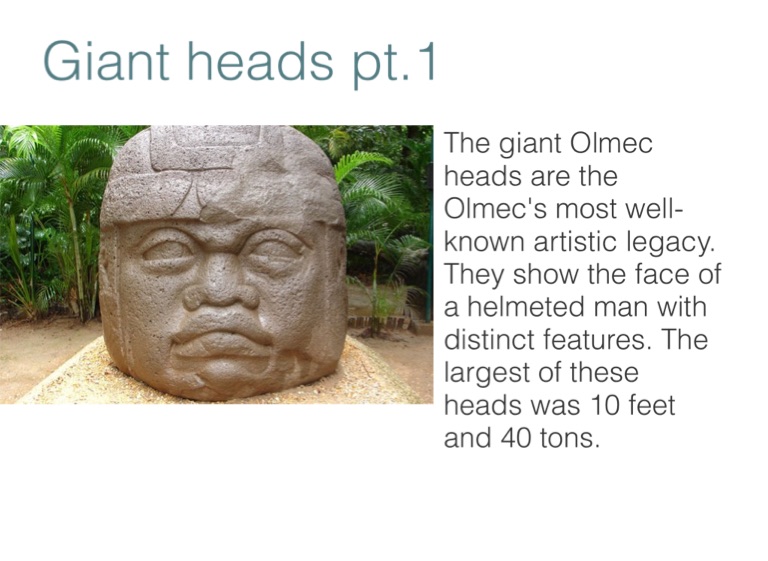 The giant Olmec heads are the Olmec's most well-known artistic legacy. They show the face of a helmeted man with distinct features. The largest of these heads was 10 feet and 40 tons.