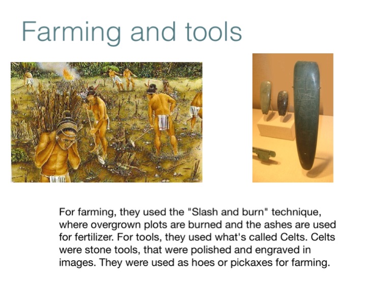 For farming, they used the "Slash and burn" technique, where overgrown plots are burned and the ashes are used for fertilizer. For tools, they used what's called Celts. Celts were stone tools, that were polished and engraved in images. They were used as hoes or pickaxes for farming.