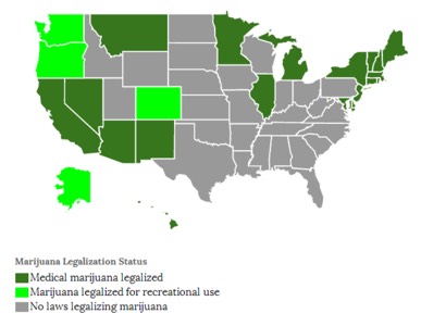Medical use of marijuana is legal in Alaska, Arizona, California, Colorado, Nevada, Oregon, Washington and a few other states as well. Recreational use of Marijuana is legal in Colorado, Alaska, Oregon, and Washington.