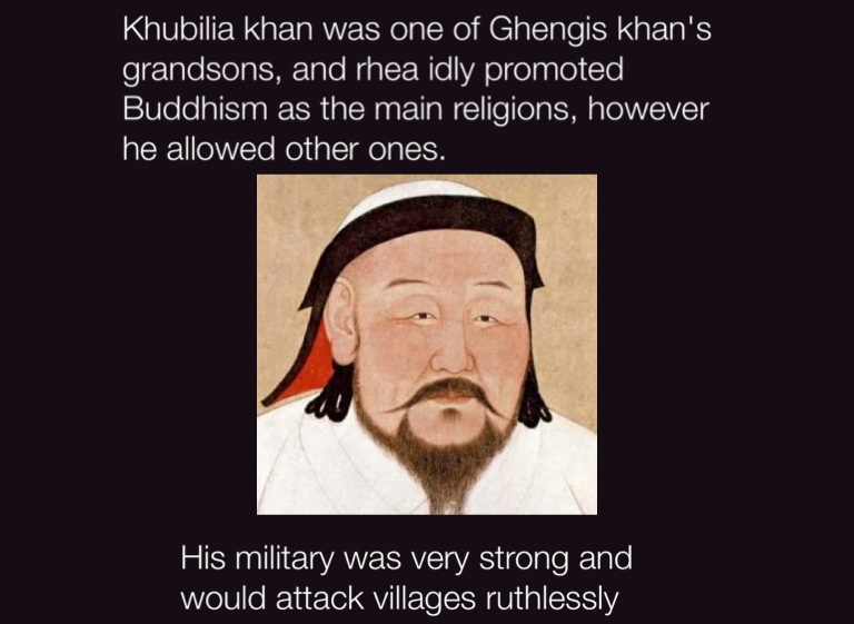 Khubilia khan was one of Ghengis khan's grandsons, and rhea idly promoted Buddhism as the main religions, however he allowed other ones.