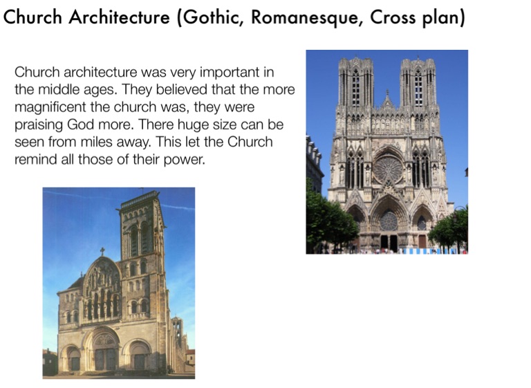 Church architecture was very important in the middle ages. They believed that the more magnificent the church was, they were praising God more. There huge size can be seen from miles away. This let the Church remind all those of their power.